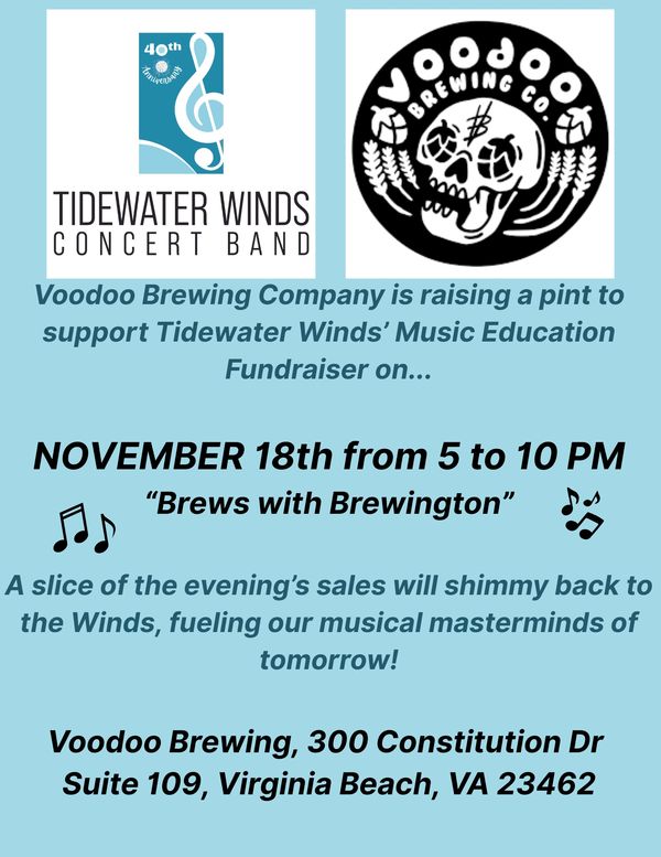 Join the Winds Board, Staff and Musicians at Voodoo Brewing Company, where we eat and drink to raise funds for Tidewater Winds' RiME Literac...