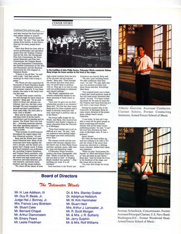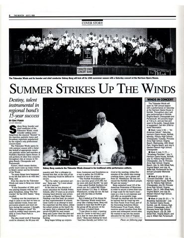The late C. Sidney Berg founded The Tidewater Winds Professional Concert Band in 1985 to provide an opportunity for residents of the Hampton Roads area to enjoy free professional band concerts in the “Sousa Band” tradition. Funding comes from various local and state grants, as well as contributions from businesses and individuals. The inaugural concert of this band took place on July 7, 1985 at Norfolk’s Town Point Park. Maestro Berg conducted the Winds until his passing in 2000. Sidney Berg died at 81, on April 30, 2000, in Virginia Beach. Sidney Berg was a graduate of the University of Michigan, where he received his B.M. and M.M. degrees in music education. He came to Norfolk in 1944 as band director and later orchestra director at Maury High School. The band, under his leadership for 19 years, earned national recognition.
