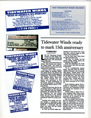 A partnership develops with Norfolk Collegiate Schools Music Department. Tidewater Winds musicians provide MAster Classes and support the pit musicians for their annual Broadway Musical student projects. In exchange for support, Norfolk Collegiate School trades the use of the theatre for summer cocnerts.