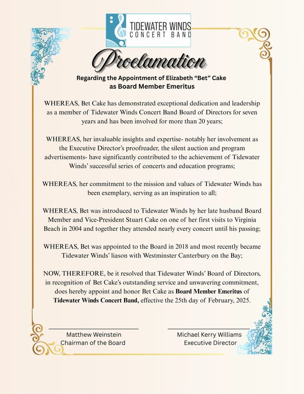 National Association of Concert Bands honors Tidewater Winds for our 40 years of service to music and the community of Hampton Roads.