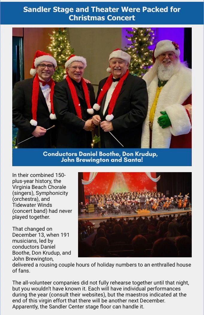 Tidewater Winds was proud to join in with Symphonicity and Virginia Beach Chorale for our annual Holiday Concert at Sandler Center for the Arts. The article to the left was submitted by Joel Rubin and for that we are grateful! A correction on the 3rd paragraph, we're not all, "all-volunteer".